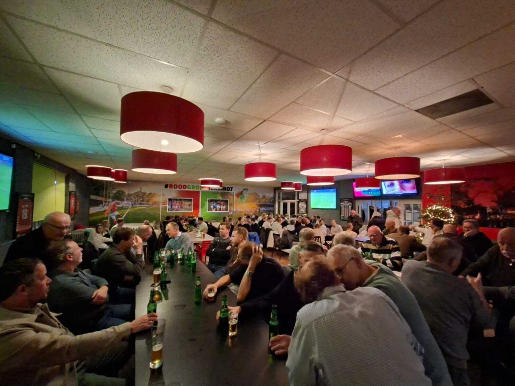 Leiders/trainers/bestuursleden liepen met volle schalen door de kantine en buiten om oliebollen uit te delen. Na de “training” was het een gezellig samenzijn in de volle kantine. Tot ieders verrassing had de Kerstman ook nog even tijd. Tijdens het rondje met de hond, liep hij over de Kolenbranderweg en zag de gezelligheid in de kantine. De kerstman werd verwelkomt met het clublied ( klonk hem bekend in de oren) en richtte zich kort tot de menigte.