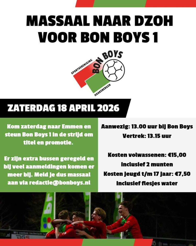 Geweldig, al dat enthousiasme voor de uitwedstrijd van Bon Boys 1 tegen DZOH (zaterdag 18 april om 15.00 uur). Bij winst is het kampioenschap een feit. Dit willen we binnenhalen met zoveel mogelijk rood-groene supporters langs de lijn. Hoe geweldig is dat?